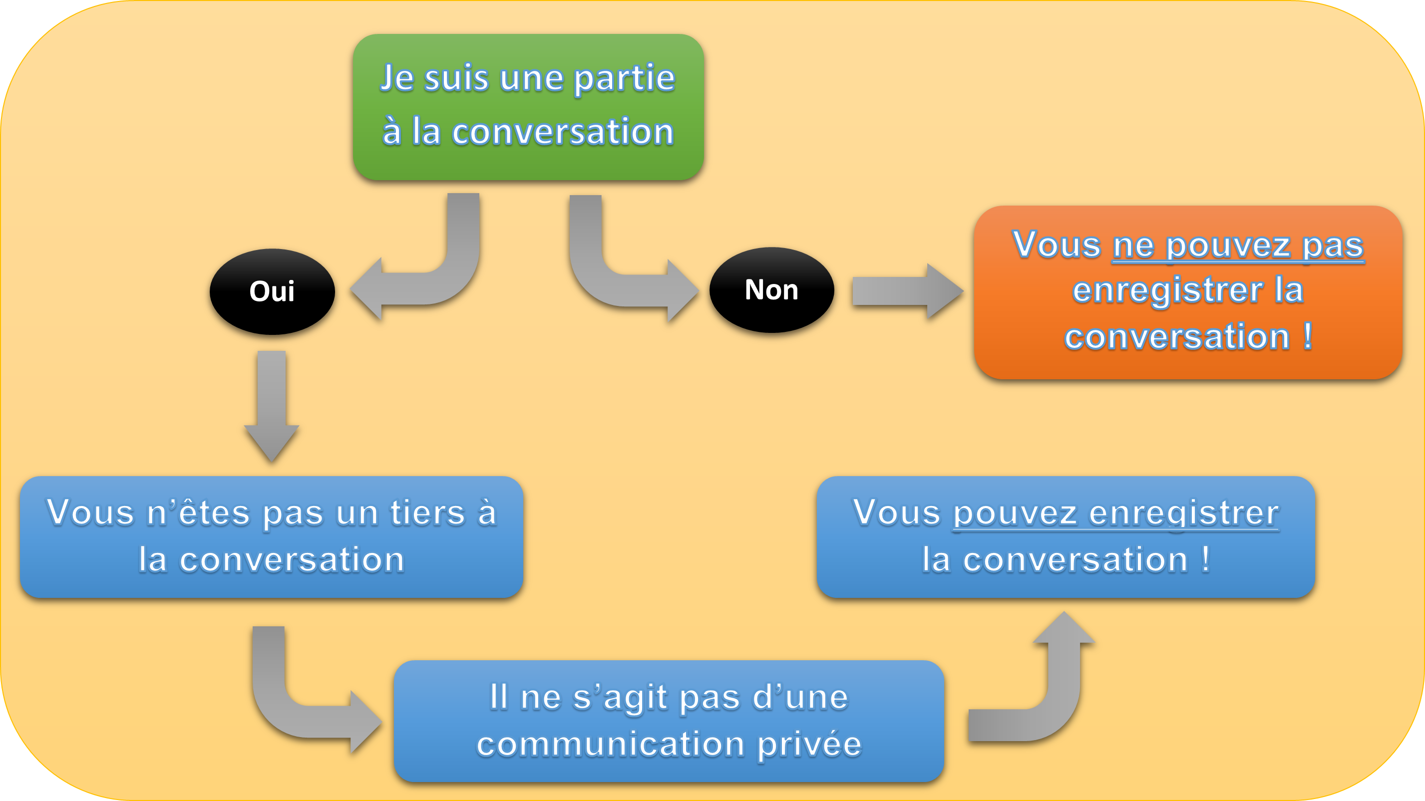Il est donc interdit en vertu de la loi d’enregistrer une communication privée, c’est à dire lorsque vous ne faites pas partie de la communication.